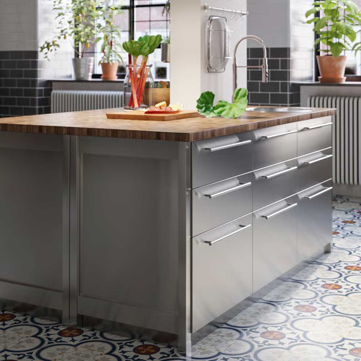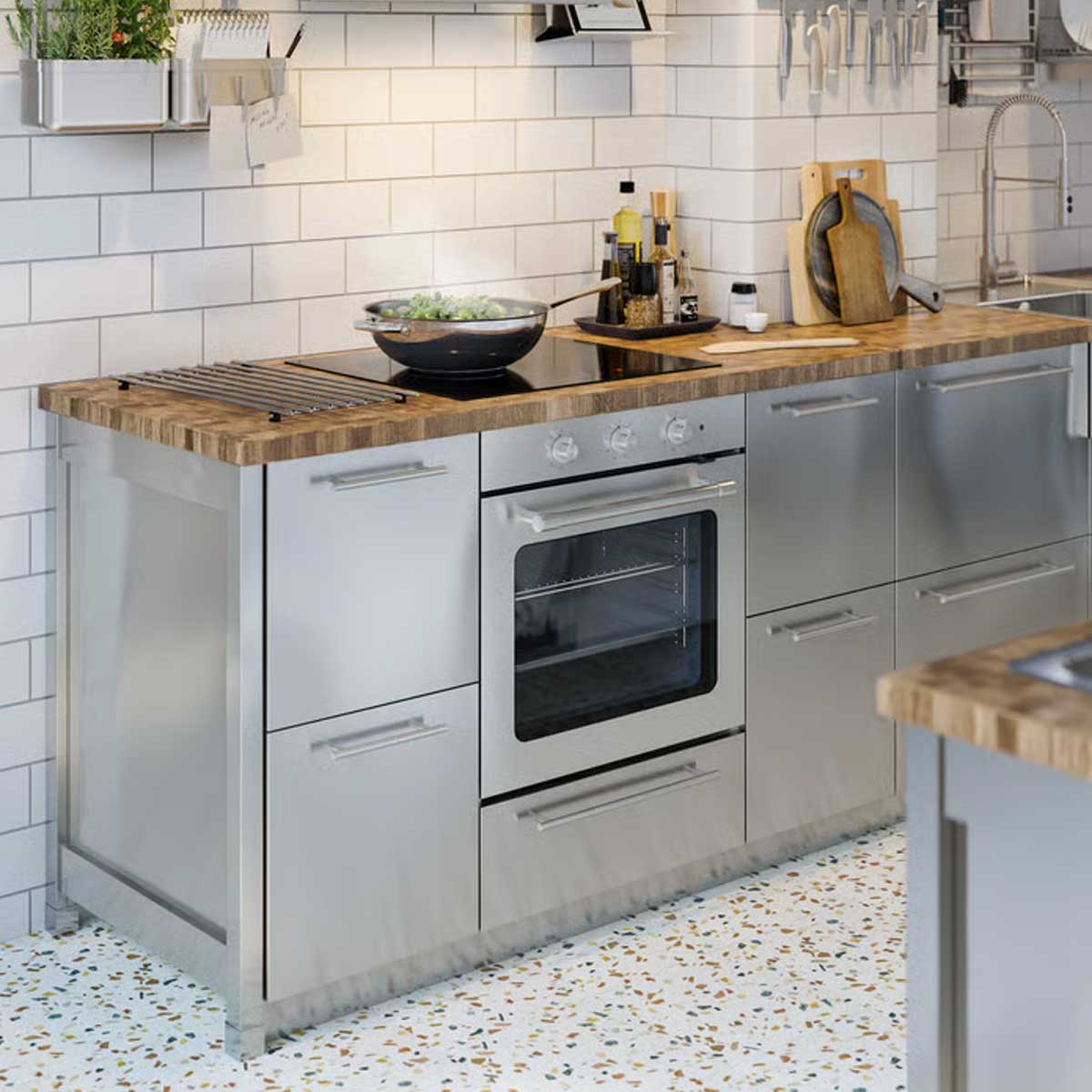 Með VÅRSTA framhliðum úr endingargóðu ryðfríu stáli fær eldhúsið flottan iðnaðarblæ. Fíngert og fallegt yfirborðið er bæði glæsilegt og þægilegt í þrifum. Bættu við borðplötu úr gegnheilum við og vönduðum eldhúsáhöldum til að skapa faglegt yfirbragð sem veitir innri kokkinum innblástur um ókomin ár.