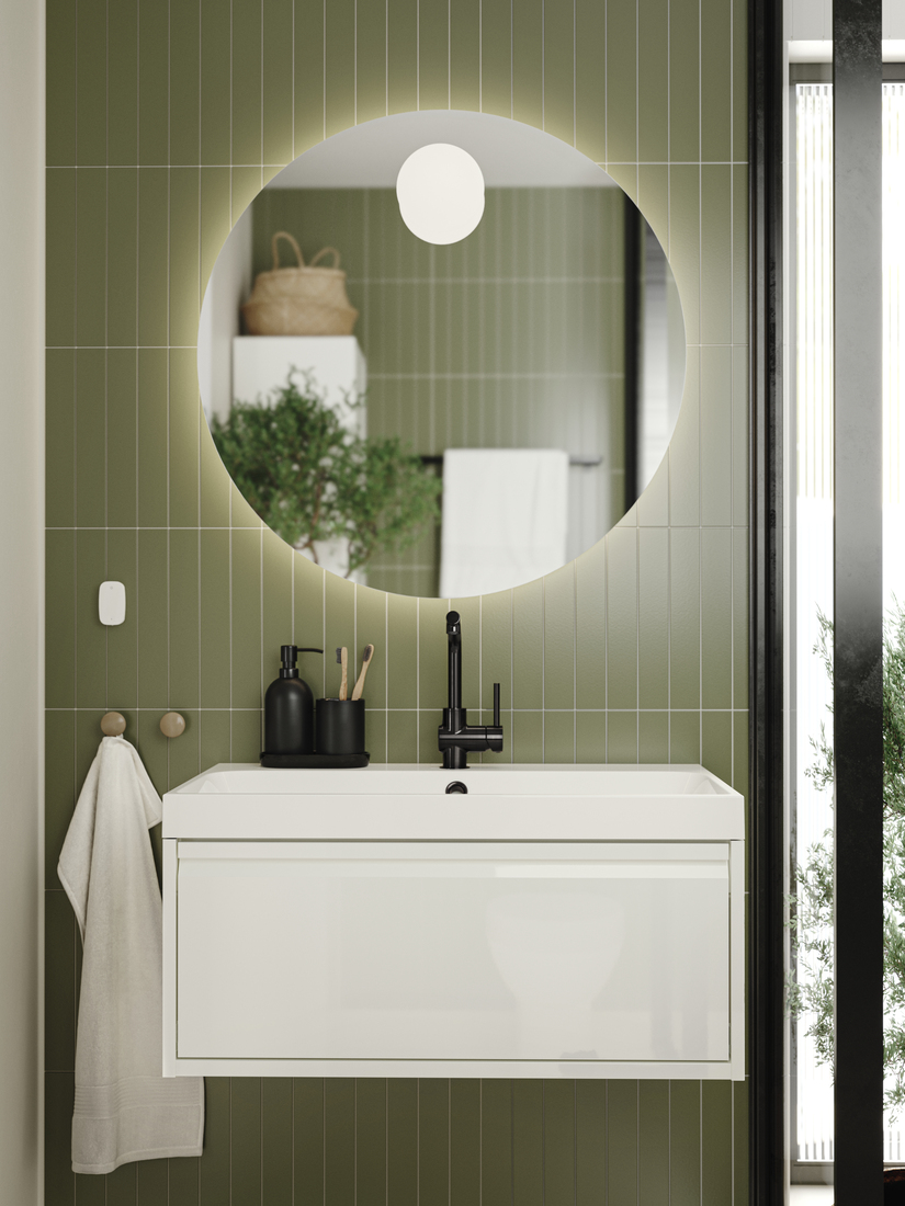 Hér er fallegt og nútímalegt baðherbergi þar sem þín vellíðan er í hávegum höfð. Lækkaðu birtuna á innbyggðu ljósinu á speglinum til að skapa notalegt andrúmsloft, vitandi það að allt er á sínum stað í skipulagsvörunum í skúffunum. Dragðu andann inn um nefið og út um munninn.