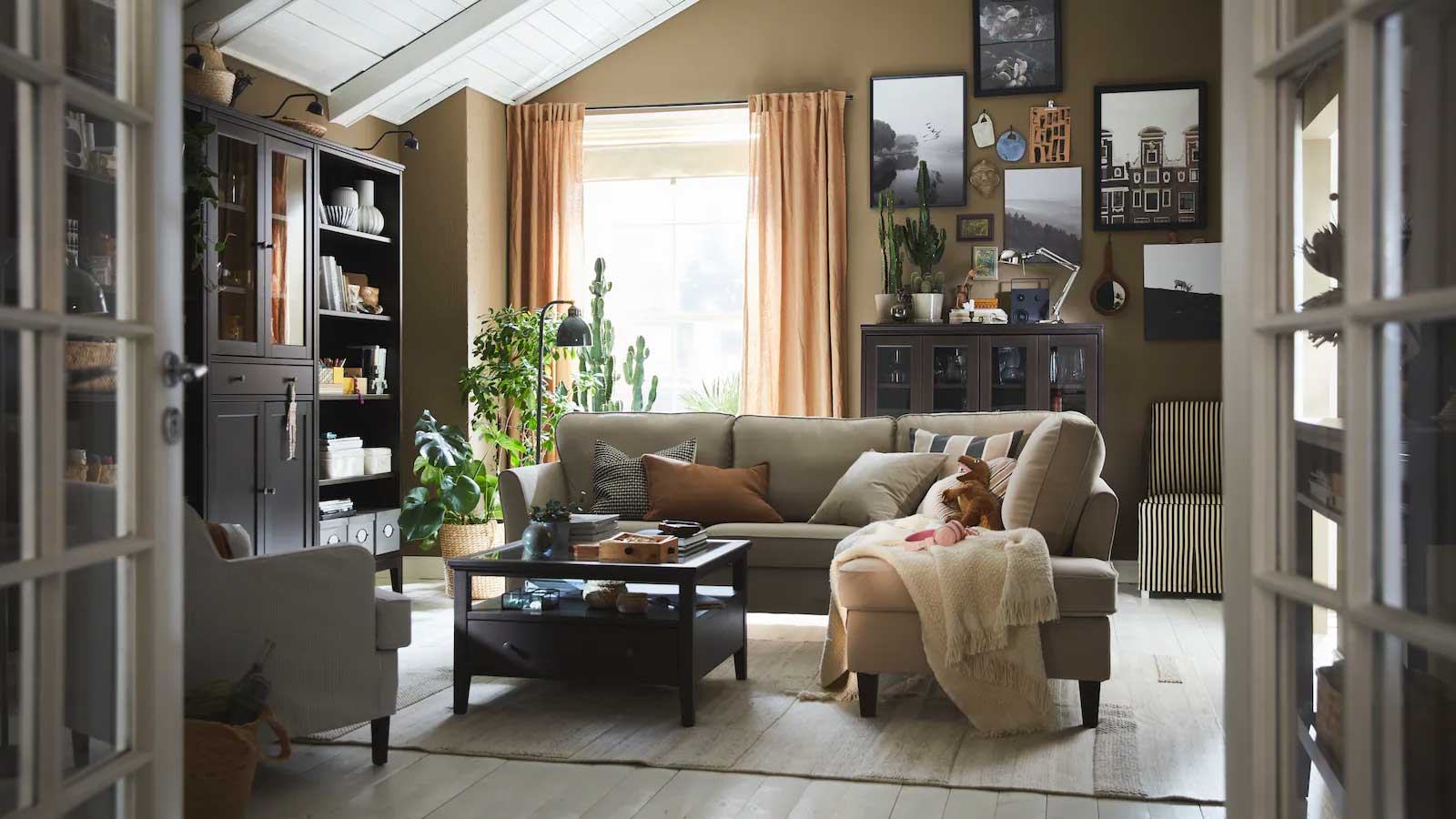 Vel skipulögð hirsla með sígildu yfirbragði ásamt rúmgóðum sófa með púðum og teppum gera rýmið að notalegum stað fyrir alla fjölskylduna. Bættu við notalegum litatónum – dökk húsgögn skapa grunninn og drappaðir og brúnir tónar færa rýminu hlýju. Þannig skapar þú stofu sem tekur vel á móti öllum með afslöppuðu andrúmslofti.