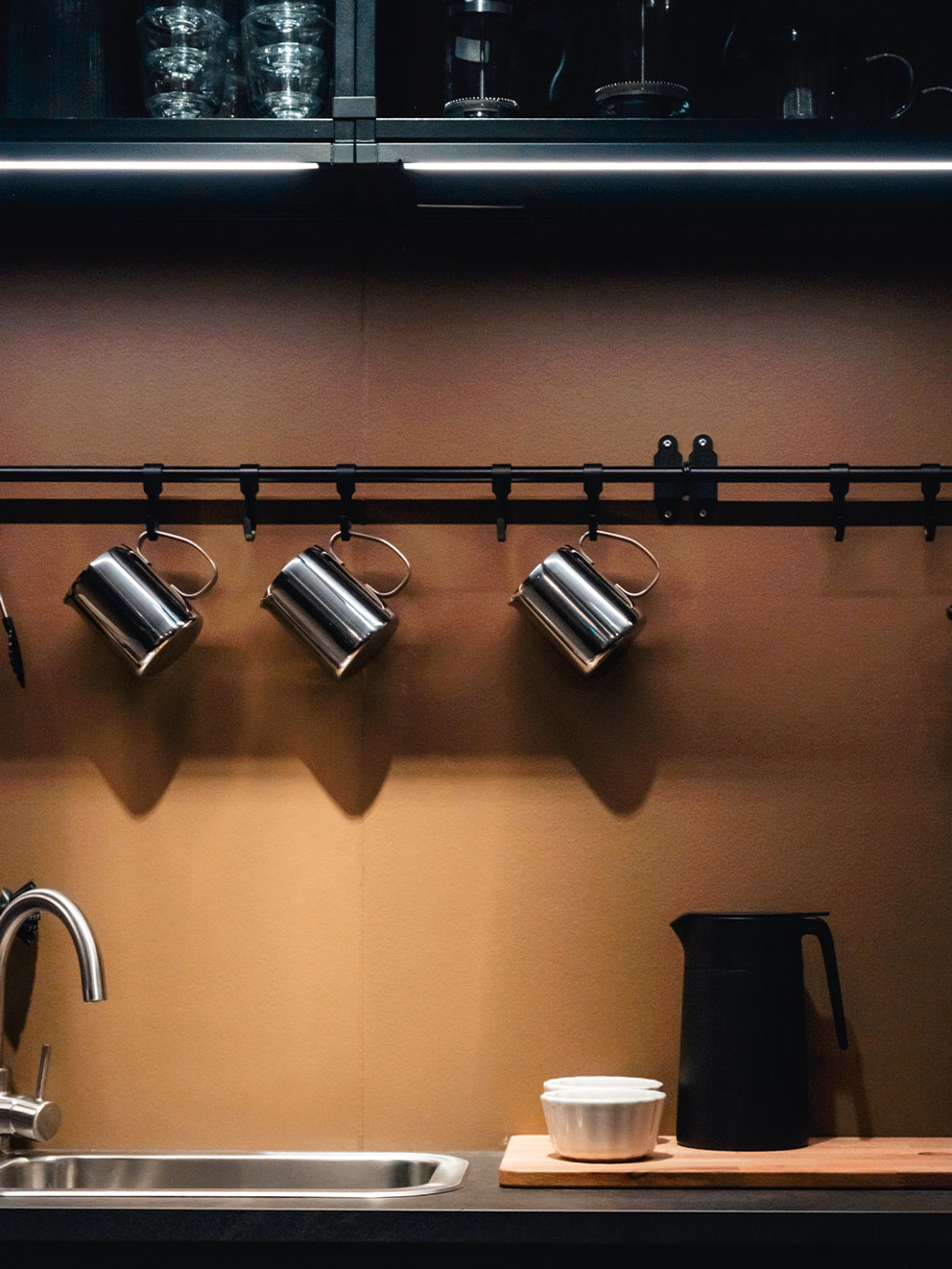 Hér er allt útpælt – allt frá lit á veggjum og borðplötum að glösum og flokkunaraðstöðu. Þó að grunnurinn að flestum rýmum sé sá sami þá er að ýmsu að huga þegar rýmið er ætlað fyrir rekstur. Hentisemi skiptir gríðarlega miklu máli ásamt lýsingu og hirsluplássi.