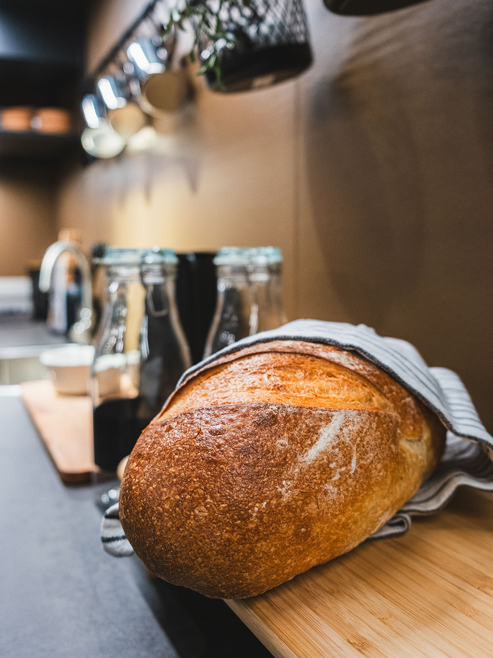 Lítið kaffihús, með mikinn karakter! Hlýleg málning á veggjum, fallegar borðplötur í djúpum viðarlit, ljósaskermar úr náttúrulegum efnivið í bland við svartar opnar hirslur, hillur, framhliðar og klæðningar (sem eru í raun hurðir) – allt þetta kallar fram heimilislega og þægilega stemningu.