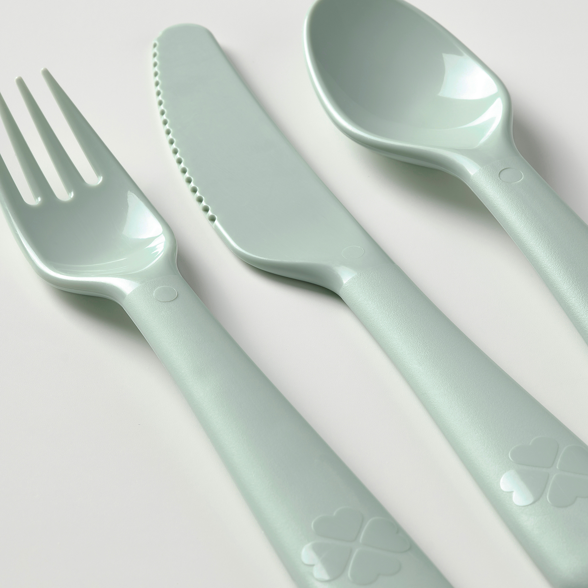 The knife blade has a serrated edge to be easy for the child to cut and divide food with.