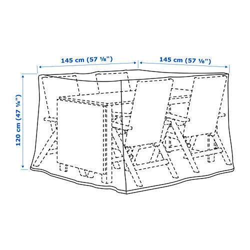 Ábreiðan er 145×145×120 cm. Hún passar fyrir borð og fjóra stóla.