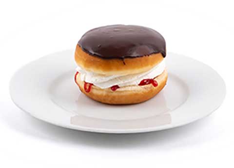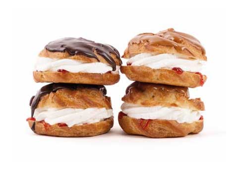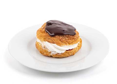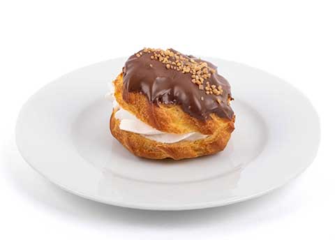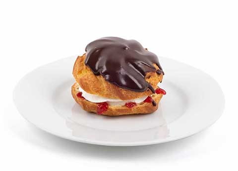 Vatnsdeigsbolla 43% (EGG (gerilsneydd EGG, vatn, rotvarnarefni (E211), þráavarnarefni (E330)), vatn, HVEITI, SMJÖR (RJÓMI, salt)), glassúr 21% (flórsykur (súkrósi, kartöflusterkja), vatn, kakó, smjörlíki (jurtaolíur (pálmaolía, repjuolía), vatn, ýruefni (E322, E471), salt, bragðefni, andoxunarefni (E306, E304i), þráavarnarefni (E202), sýra (E330), gerjað HVEITI, litarefni (E160ai)), vanilludropar (vatn, síróp, bindiefni (E1520), vanillubragðefni, alkóhól, litarefni (E150a))), jurtarjómi 19% (blandaður RJÓMI (RJÓMI, UNDANRENNA, jurtaolíur, hert jurtafita, ýruefni (E471, E432, E433), bindiefni (E407))), RJÓMI 10%, hindberjasulta 6% (hindber, sykur, vatn, hleypiefni (E440), sýra (E330), rotvarnarefni (E211, E202), litarefni (E163), hindberjabragðefni).