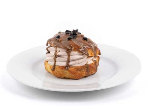 Vatnsdeigsbolla 45% (EGG (gerilsneydd EGG, vatn, rotvarnarefni (E211), þráavarnarefni (E330)), vatn, HVEITI, SMJÖR (RJÓMI, salt)), jurtarjómi 20% (blandaður RJÓMI (RJÓMI, UNDANRENNA, jurtaolíur, hert jurtafita, ýruefni (E471, E432, E433), bindiefni (E407))), HNETU- og súkkulaðismjör 20% (sykur, repjuolía, HESLIHNETUR 13%, fitusnautt kakóduft, UNDANRENNUDUFT, kakósmjör, MYSUDUFT, ýruefni (sólblómalesitín, bragðefni)), RJÓMI, bananar 3%, bananapúrra 2.5% (bananapúrra (bananar, þrávarnarefni (E300)), hvítt súkkulaði (sykur, grænmetisfita (fullhert pálmakjarnaolía), MJÓLKURDUFT, ýruefni (E322), náttúruleg bragðefni), HNETUKURL 2% (sykur, HESLIHNETUR).