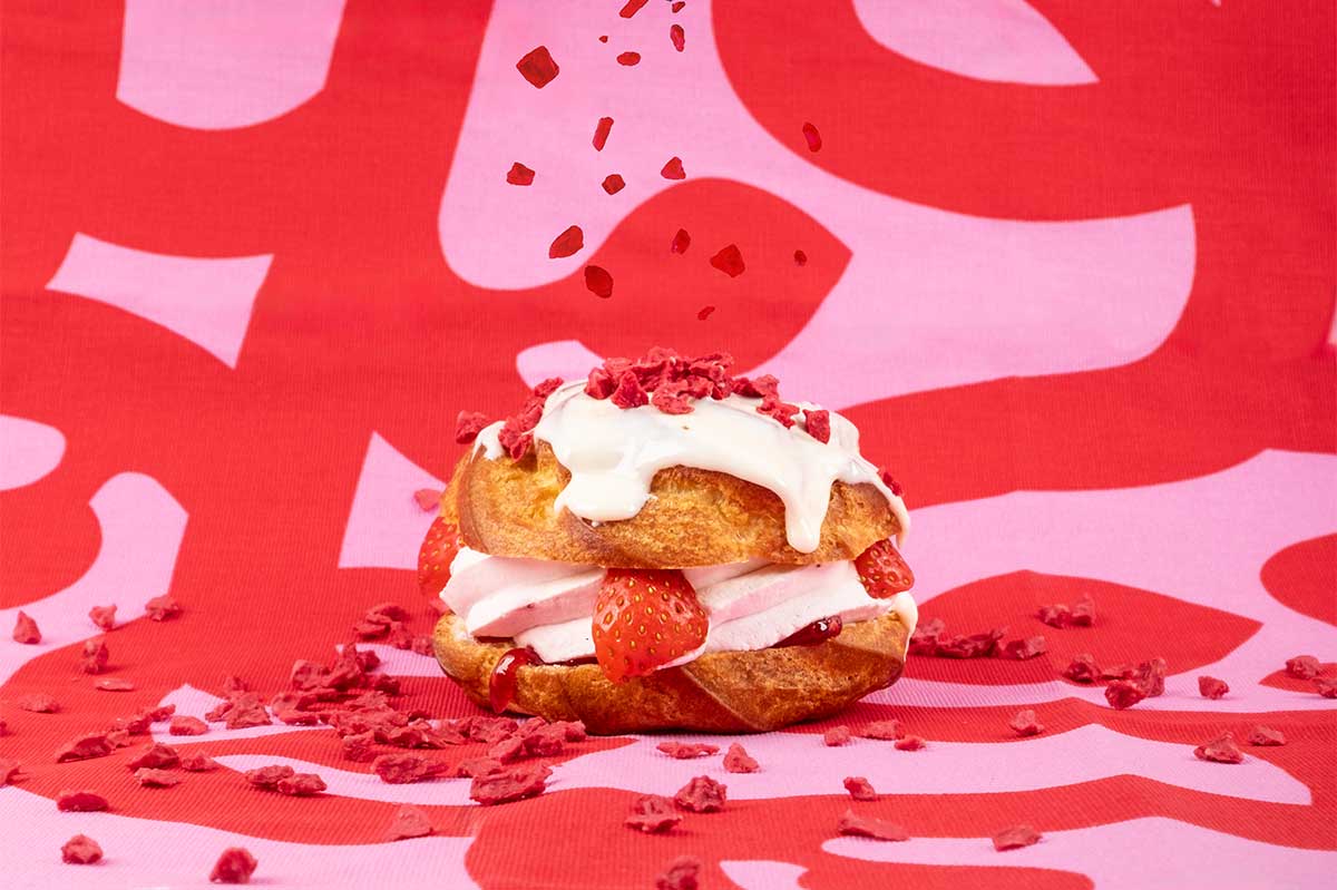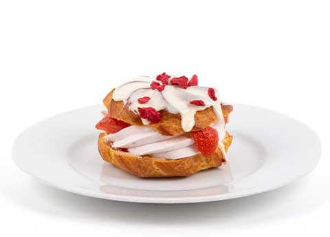 Vatnsdeigsbolla 44% (EGG (gerilsneydd EGG, vatn, rotvarnarefni (E211), þráavarnarefni (E330)), vatn, HVEITI, SMJÖR (RJÓMI, salt)), jurtarjómi 32% (blandaður RJÓMI (RJÓMI, UNDANRENNA, jurtaolíur, hert jurtafita, ýruefni (E471, E432, E433), bindiefni (E407))), hvítt súkkulaði (sykur, grænmetisfita (fullhert pálmakjarnaolía), MJÓLKURDUFT, ýruefni (E322), náttúruleg bragðefni), jarðarberjamauk 3.3% (jarðarber, sykur), jarðaberjabragðefni 1.5% (sykur, jarðarber, vatn, ávaxtaþykkni, sýra (E330), bragðefni, hleypiefni (E440)), gel (vatn, sykur, glúkósasíróp, hleypiefni (E440), sýra (E330), þráavarnarefni (E223)), matarlím (gelatín).