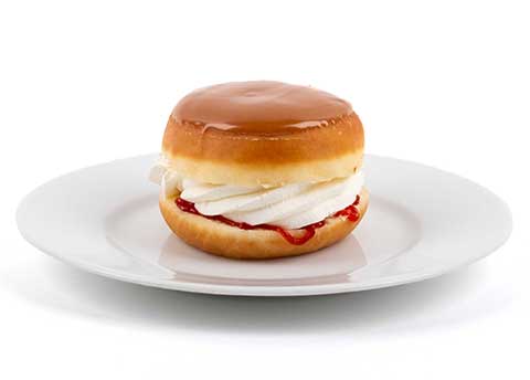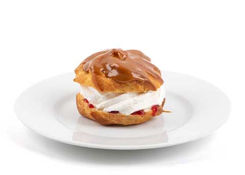 Vatnsdeigsbolla 44% (EGG (gerilsneydd EGG, vatn, rotvarnarefni (E211), þráavarnarefni (E330)), vatn, HVEITI, SMJÖR (RJÓMI, salt)), karamelluglassúr 20% (sykur, vatn, maíssíróp, maíssterkja, invert sykur, litarefni (E150d, E160b), salt, dextrósi, rotvarnarefni (E211, E202), sýrustillir (E575, E330), bindiefni (E406), þykkingarefni (E1422), náttúruleg og gervi karamellubragðefni, ýruefni (E471)), jurtarjómi 20% (blandaður RJÓMI (RJÓMI, UNDANRENNA, jurtaolíur, hert jurtafita, ýruefni (E471, E432, E433), bindiefni (E407))), RJÓMI 10%, hindberjasulta 6.6% (hindber, sykur, vatn, hleypiefni (E440), sýra (E330), rotvarnarefni (E211, E202), litarefni (E163), hindberjabragðefni).