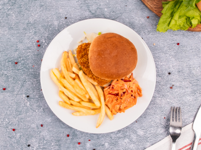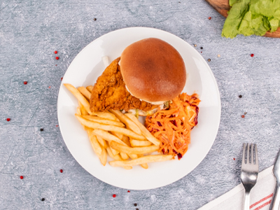 Kjúklingaborgari (kjúklingur (kjúklingabringa 84%, vatn, salt, HVEITI, maíssterkja, svartur pipar, hvítur pipar, paprika, engifer, hvítlauksduft, glúkósasíróp, sýrustillir (E500), bindiefni (E450), rotvarnarefni (E262), þráavarnarefni (E320), bragðefni, krydd, repjuolía)), franskar (kartöflur, sólblómaolía, repjuolía), chilli-hrásalat (rauðkál, hvítkál, repjuolía, gulrætur, SOJABAUNIR, HVEITI, hvítlaukur, tómatar, laukur, náttúruleg bragðefni (MÖNDLUR), chilli, salt, sykur, sítrónusafi, SINNEPSMJÖL, krydd, pipar, litarefni (E100, E150c), sýrustillar (E260, E300, E330), rotvarnarefni (E202, E211, E224 (SÚLFÍT)), bindiefni (E412, E415, E1442)), vegan piparmajónes (repjuolía, vatn, sætt SINNEP (vatn, edik, glúkósa- og frúktósasíróp, sykur, HVEITI, SINNEPSMJÖL, salt, sterkja, krydd (karrý, túrmerik, kóríander), sýrustillir (E330), rotvarnarefni (E202)), sítrónusafi (sítrónusafi, rotvarnarefni (E224, SÚLFÍT)), svartur pipar, edik, salt, sykur, SINNEPSDUFT, bindiefni (E1450, E415, E412), rotvarnarefni (E211, E202)), kartöfluhamborgarabrauð (HVEITI, kartöflur, EGG, sykur, repjuolía, ger, gljái (vatn, sólblómaolía, grænmetisprótein (bauna-, kartöflu- og bóndabaunaprótein), þrúgusykur, maltódextrín, sterkja), HVEITIGLÚTEN, vatn, maíssterkja, salt, ýruefni (E471, E481), mjölmeðhöndlunarefni (E300)), jöklasalat.