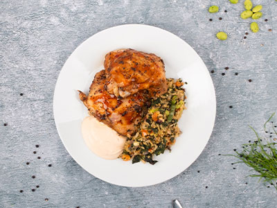 Kjúklingalæri með beini (kjúklingalæri, repjuolía, krydd (innih. SINNEPSFRÆ), salt, fullhert repjuolía, kryddþykkni, rotvarnarefni (E262), kínóagrænmetisblanda (grænmeti (tómatar, grænkál, SOJABAUNIR, rauðlaukur, blaðlaukur), kínóa 17% (vatn, kínóa), brún hrísgrjón, sólblómaolía, vatn, krydd (salt, maltódextrín, krydd), sykur, karríkryddblanda (túrmerik, kóríander, grikkjasmári, engifer, kúmen, salt, maíssterkja, cayenne-pipar), salt), spírur, Kung Pao-sósa (SÝRÐUR RJÓMI (UNDANRENNA, RJÓMI, sýrður með mjólkursýrugerlum, gelatín, ostahleypir), Kung Pao-sósugrunnur (sykur, vatn, SOJASÓSA (vatn, SOJABAUNIR, HVEITI, salt), misó (vatn, SOJABAUNIR, hrísgrjón, salt), jurtaolía (sólblómaolía, hvítlauksolía), vínedik, umbreytt sterkja, tómatmauk, rauður pipar, jurtir og krydd, hvítlaukur, bragðefni, rotvarnarefni (E202, E211)), sítrusdressing (vatn, SOJASÓSA (vatn, SOJABAUNIR, HVEITI, salt), vínedik, sítrónusósa (sítrónusafi frá þykkni, maltódextrín, náttúruleg bragðefni), sykur, náttúruleg bragðefni, salt)).