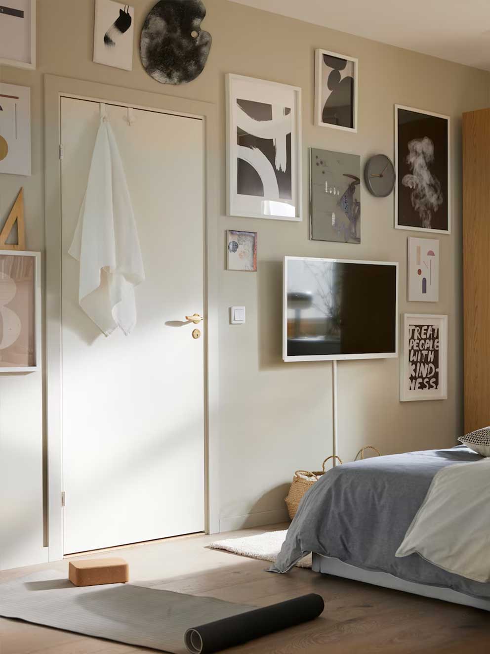 Want a TV in your bedroom, but don’t want it to be the main attraction when it’s off? Make it part of the decoration. Surround it with a collage of posters and pictures in colours and shapes that work with the décor of the rest of the space. The result? A joyful wall that sets an easy-going atmosphere when the TV is off, and won’t detract from your watching when it’s on.