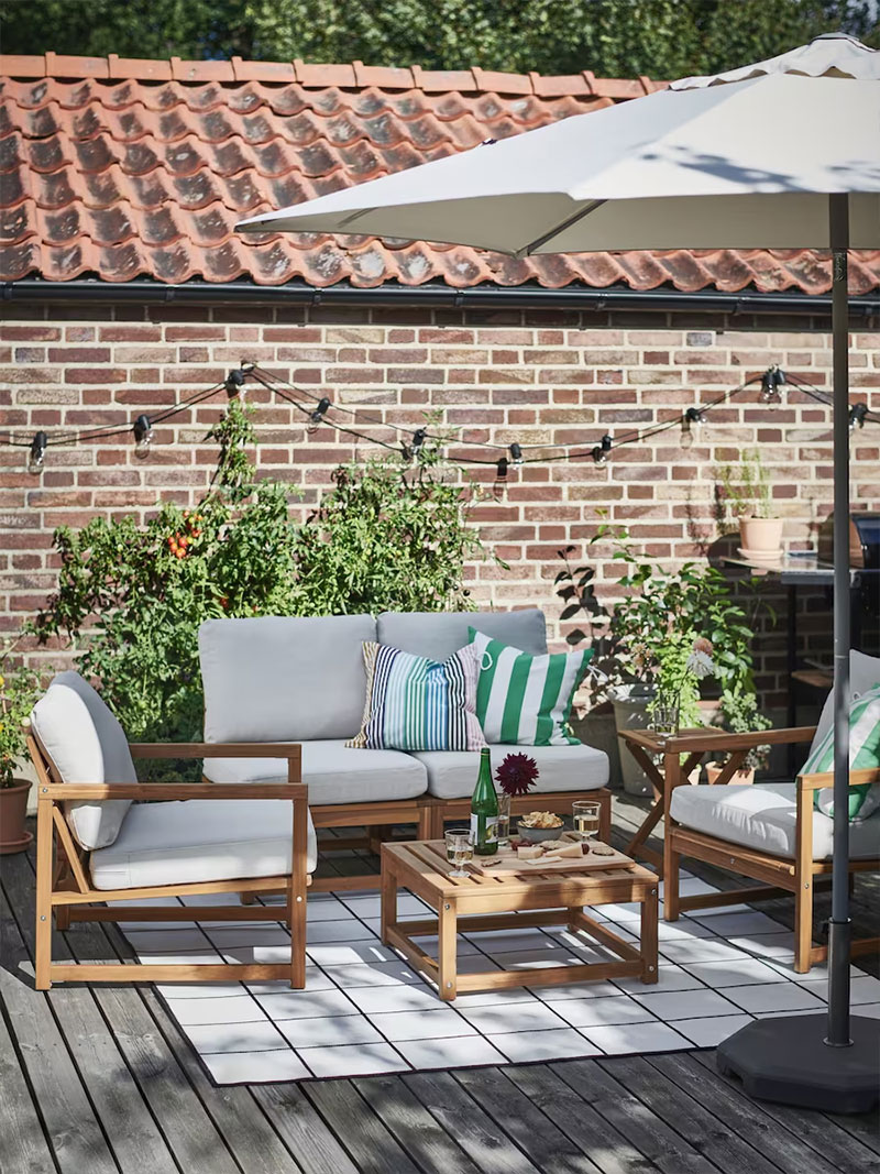 The rug and parasol together with light textiles and warm wood frame this natural gathering spot. Whatever your outdoor creed – morning coffee, relaxing with friends or long evening sessions – everyone is invited.