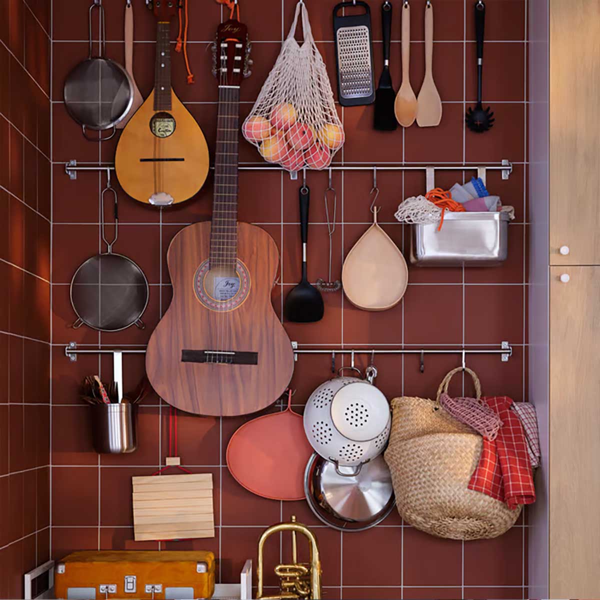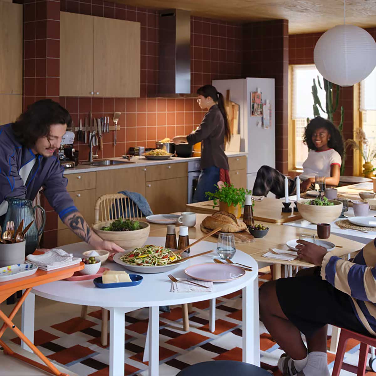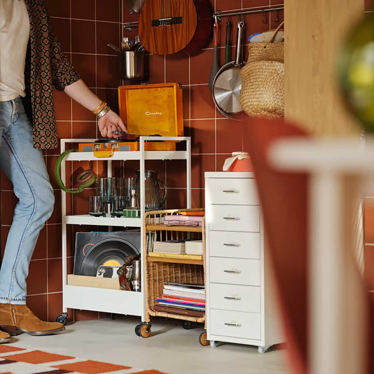 Sharing a kitchen and need more space for your belongings? Discover creative ways to make the most of what you’ve got. KUNGSFORS rails and hooks can transform wall space into handy storage for utensils, tea towels, or even your guitar. Cabinets and shelving provide room for everything from glassware and vases to your vinyl collection. Or opt for a versatile trolley like NISSAFORS, perfect for keeping your essentials together and easily rolling them wherever you need. In this communal kitchen, everyone has their own dedicated trolley, neatly parked together for a tidy and organised space.