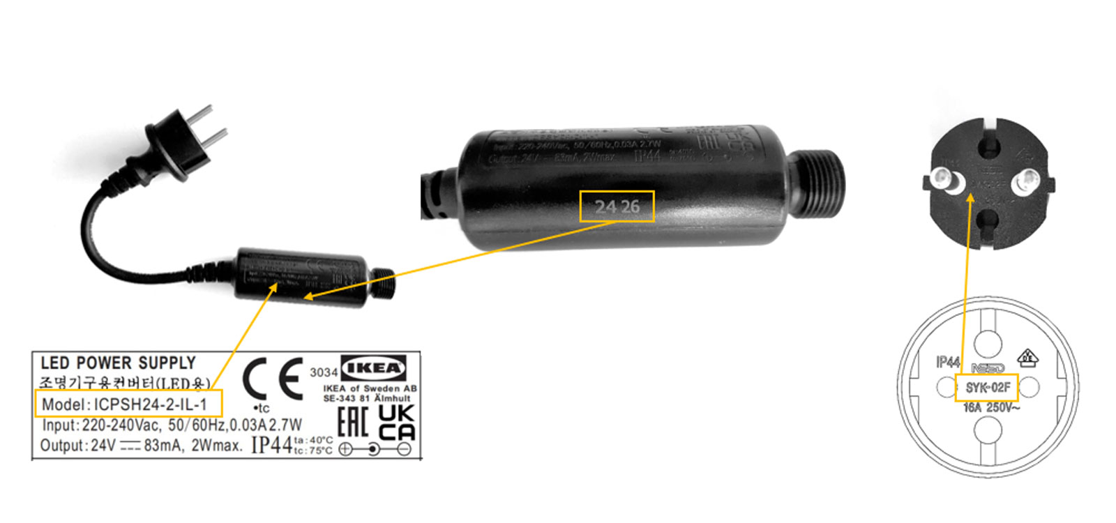 Despite this it has come to our attention that a certain plug used for the above-listed products does not comply with a relevant safety standard for limiting water ingress due to a manufacturing error. Therefore, all IKEA outdoor LED lighting chains and lamps that include the affected plug are being recalled. Affected products can be identified via name of the LED-driver (ICPSH24-2-IL-1), date stamp (YYWW – see all affected date stamps in list above) of the LED-driver, and name of the plug (SYK-02F). Products with other LED-drivers, other date stamps and another plug are not in scope of this recall.