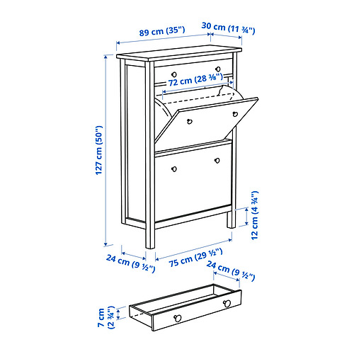 HEMNES shoe cabinet has two deep compartments, each with room for two rows of shoes. This means that you can hide away at least twelve pairs of shoes in them - and get a neat and tidy hall into the bargain. The compartments also fold down, so you can find the shoes you need quickly and easily.