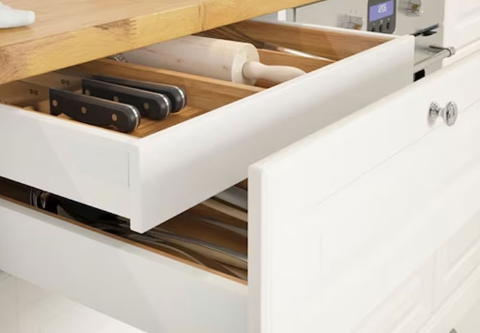 Veldu stærð skúffanna gaumgæfilega. Stærri skúffur eru hentugar fyrir potta og pönnur en litlar skúffur eru betri fyrir hnífapör og áhöld. Skoðaðu mismunandi skúffuframhliðar hér fyrir neðan.