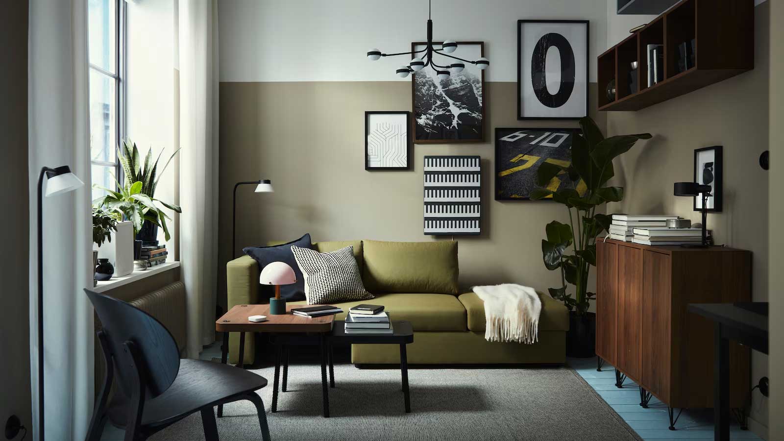 Þegar gestirnir kveðja getur þú minnkað húsgögnin og fengið meira pláss. Geymdu rúmföt undir sætinu og breyttu svefnsófanum í tveggja sæta sófa. Þú getur sett annað innskotsborðið undir hitt til að skapa gólfpláss. Jarðtónar og náttúruleg hráefni ásamt hentugum hirslum sjá um að skapa stílinn og notalegt andrúmsloft.
