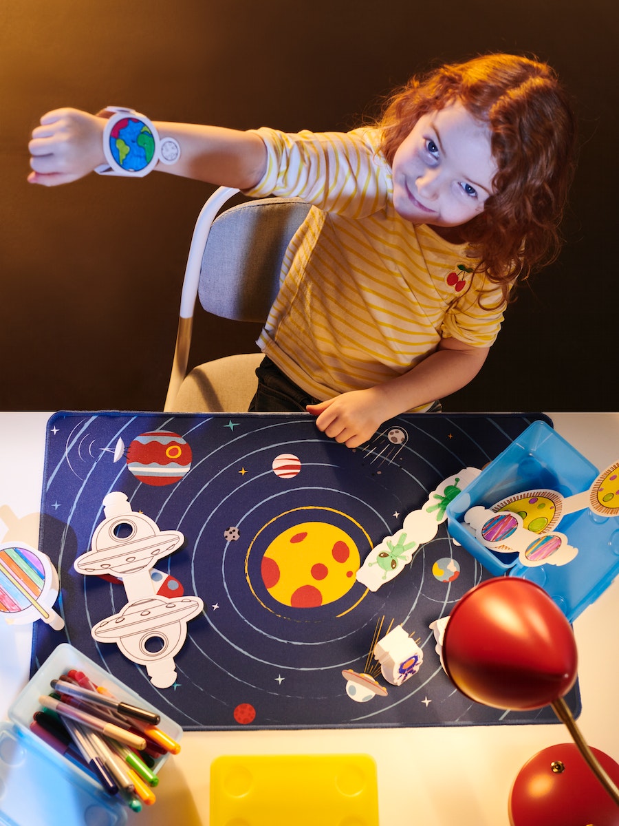 Leikur er nauðsynlegur fyrir þroska barna og við lögðum okkur fram við að hanna vörur fyrir öll börn í AFTONSPARV línunni. Línan inniheldur leikföng í geimþema líkt og mjúkar fingrabrúður, mjúkdýr, geimskip, eldflaugar og mottu með sólkerfinu okkar. Ævintýrin hefjast hér!