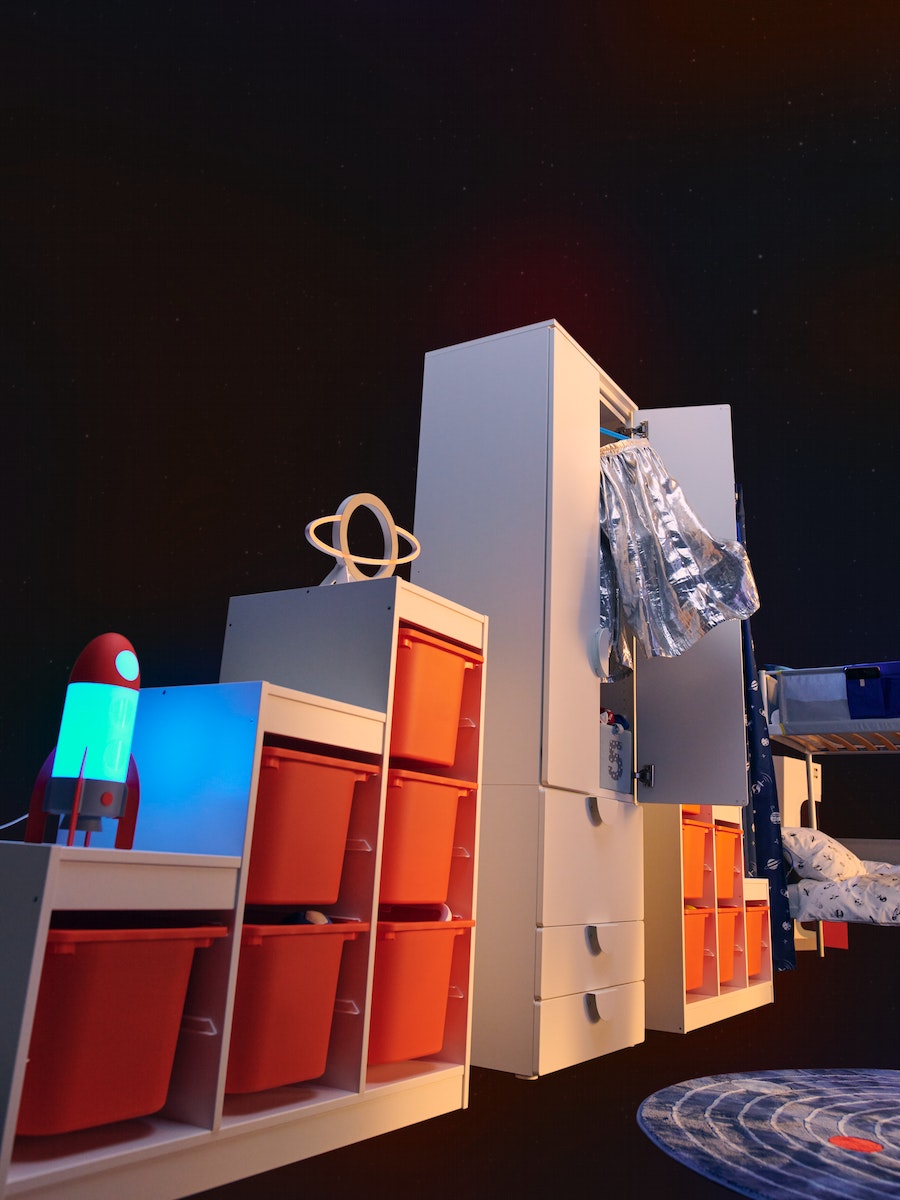 Það gæti verið gaman að hafa leikföng svífandi um allt í þyngdarleysi en svo vandast málið þegar þarf að ganga frá. Sem betur fer erum við með gott úrval af skipulagsvörum fyrir barnaherbergið, svo sem kassa og hirslur, sem hjálpa ungum geimkönnuðum að hafa allt á sínum stað. Þyngdaraflið hjálpar líka!