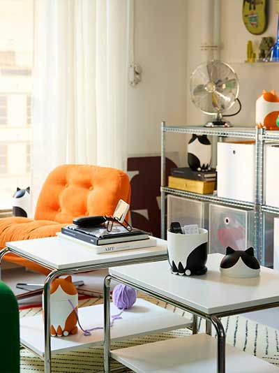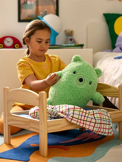 Leikur er alls konar – hann snýst um að kanna, gera tilraunir, skapa, fá útrás, keppa og ýmislegt fleira. Þess vegna finnur þú alls konar vörur í GREJSIMOJS línunni eins og skilrúm sem hægt er að fella saman í lítið hús, mjúkdýr til að knúsa, litríka gólfpúða, loðið og vinalegt áklæði á stól, veggskraut, borðspil og margt fleira.