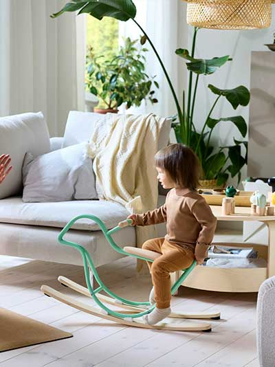 Kubbar sem líkjast skrautmunum, skemmtilegur ruggufugl, stílhreint jafnvægisbretti, falleg motta með óvæntum smáatriðum – þegar leikföngin líta svona út er tilvalið að hafa þau til sýnis! Þau gætu verið innblásturinn sem þarf til að byrja að leika.