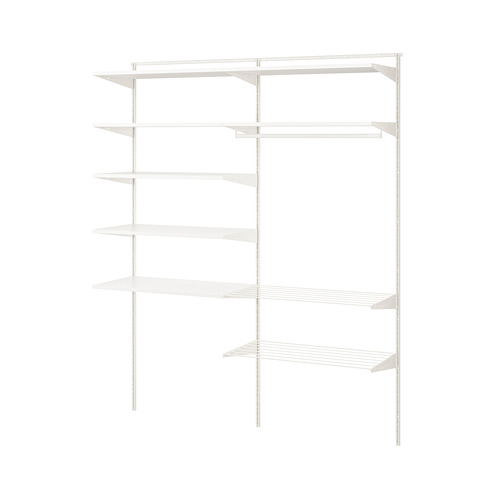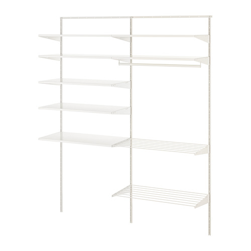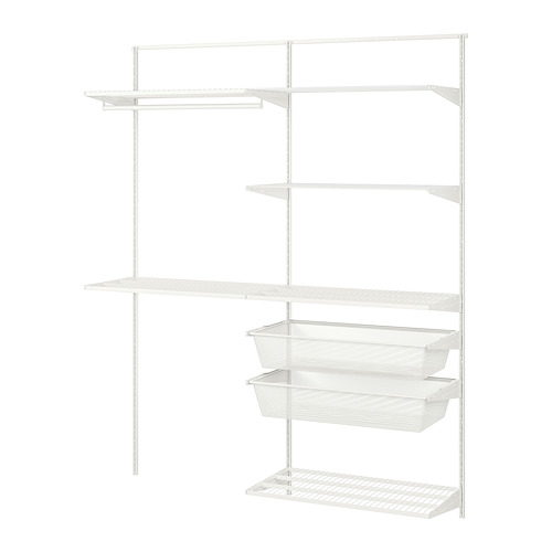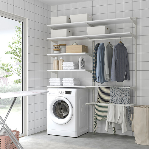 Þetta er BOAXEL, sveigjanlegar og endingargóðar vegghirslur á viðráðanlegu verði sem hjálpa þér að koma skipulagi á hlutina þína. Þær henta vel inni í svefnherbergið, fataherbergið og þvottahúsið. Þú getur auðveldlega aðlagað eða bætt við hirslurnar þegar þarfir þínar breytast. Hannaðu þína eigin lausn eða skoðaðu einhverja af samsetningunum sem við höfum nú þegar raðað saman.