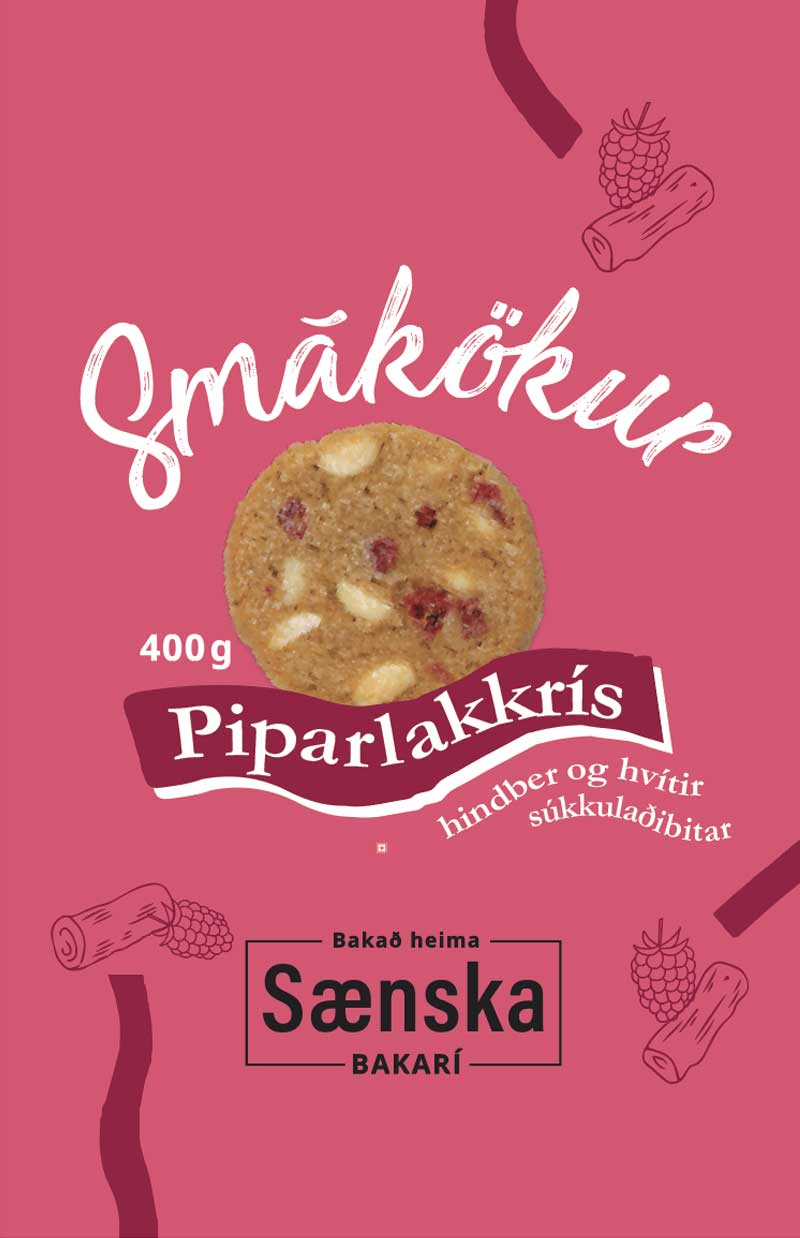 með piparlakkrís, hindberjum og hvítum súkkulaðibitum